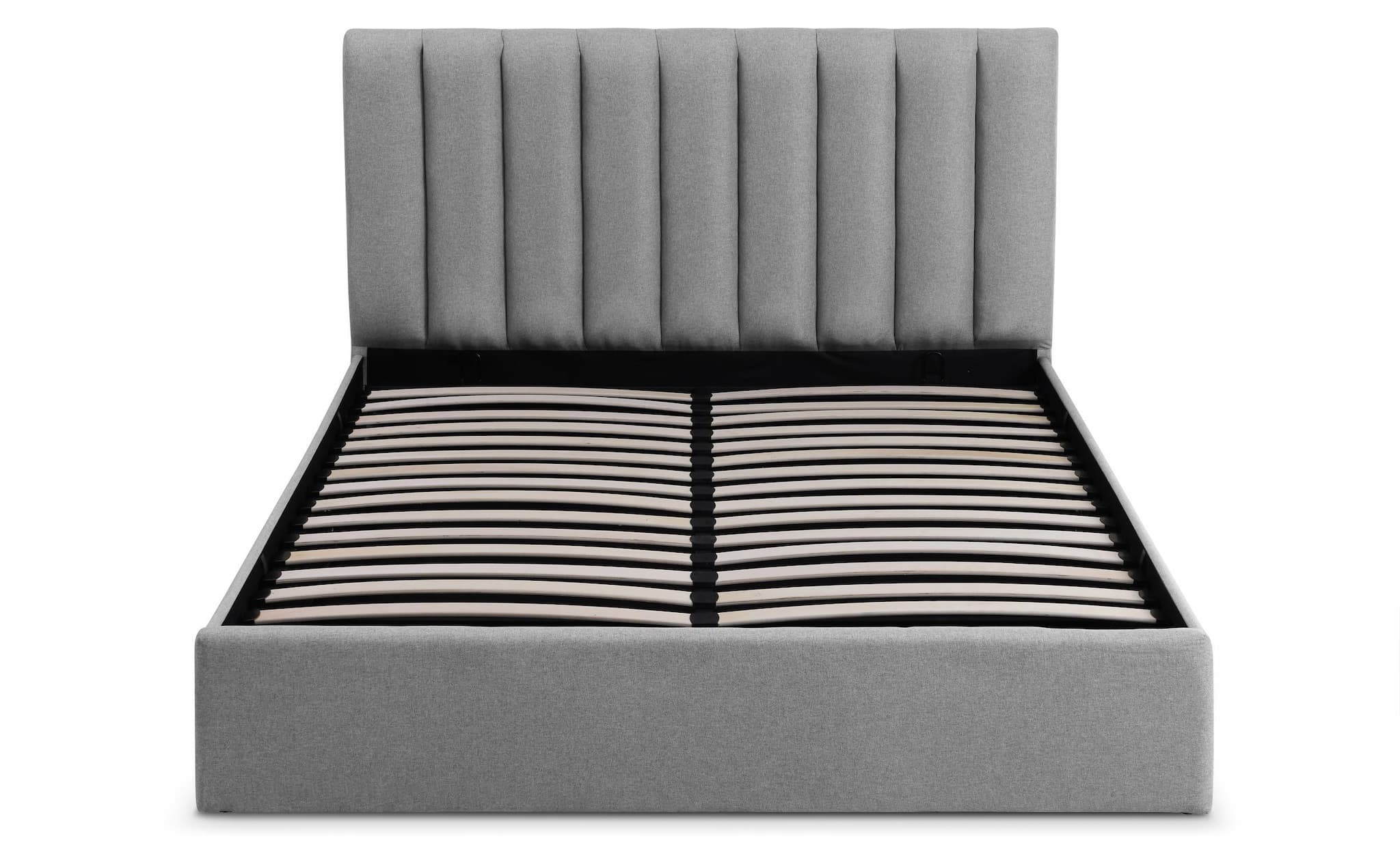 S-8025 upholstered storage bed combines a clean modern design with a gas-lift storage system and durable slatted base. Linen grey upholstery adds a timeless, versatile look.