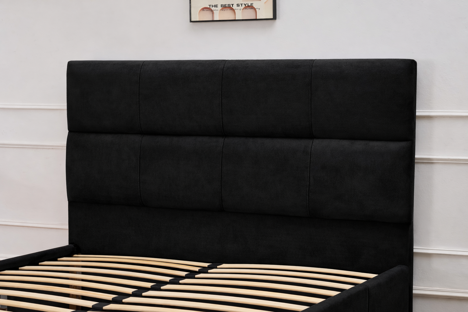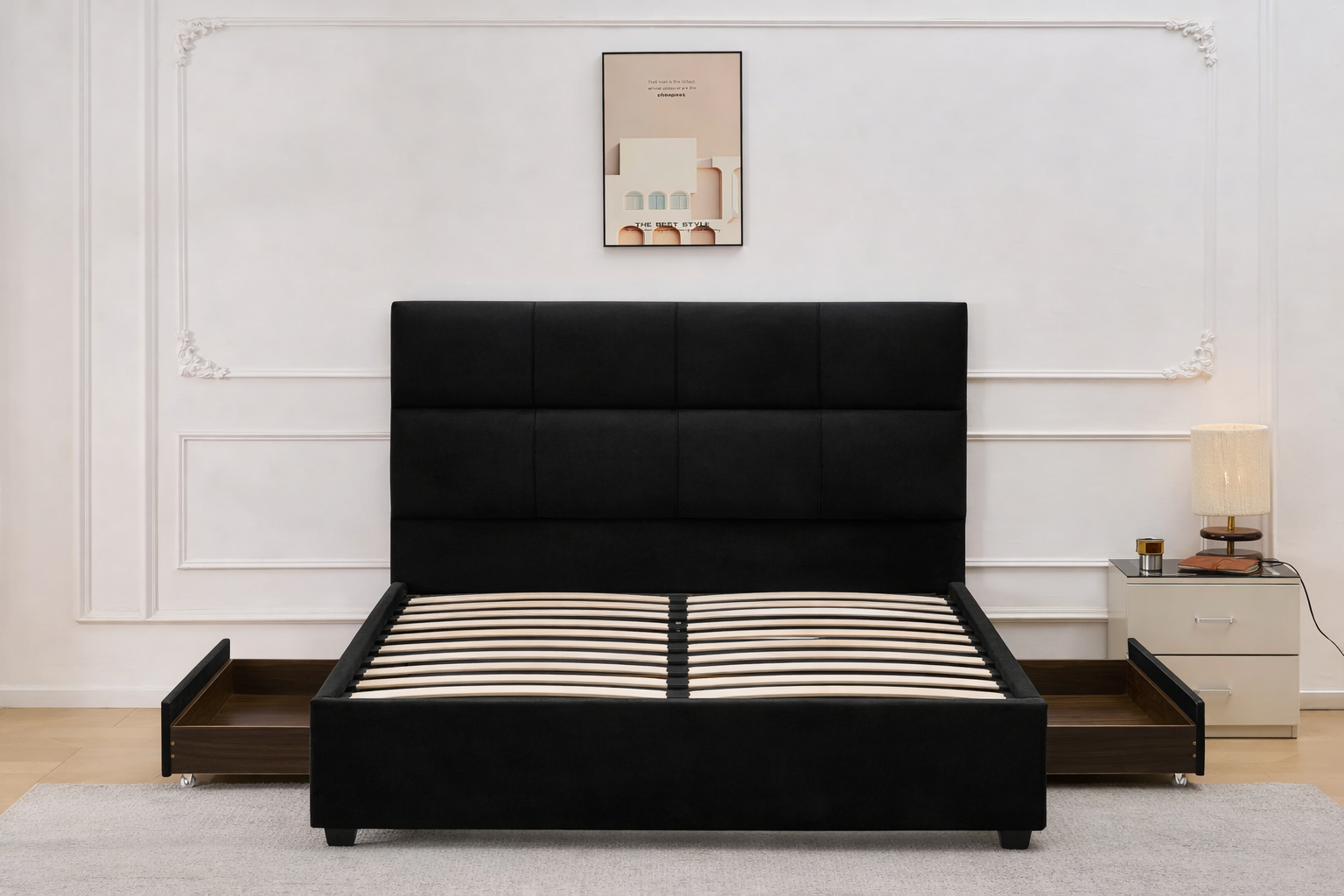 S-8032 Queen bed combines soft black velvet upholstery with a modern storage design. Featuring two spacious drawers and a sturdy sprung slat base, it offers both comfort and functionality.