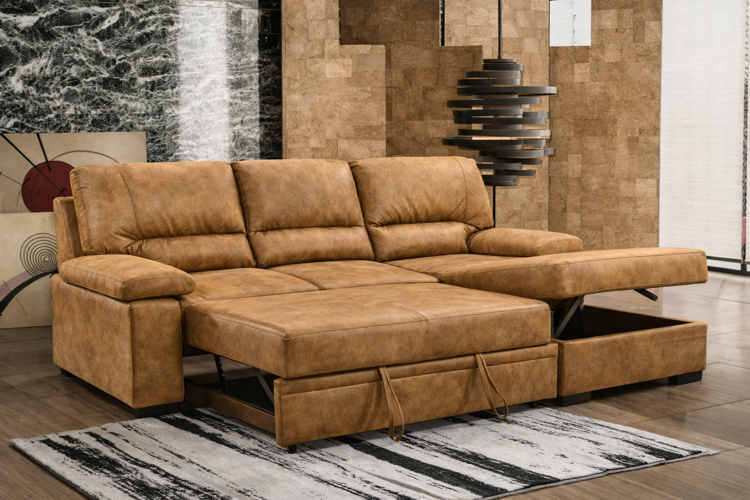 The Valery Sofa-Bed combines modern comfort with practical functionality. Upholstered in light brown fabric, it features a convertible sleeping area and built-in storage, making it ideal for everyday use and guest accommodation.