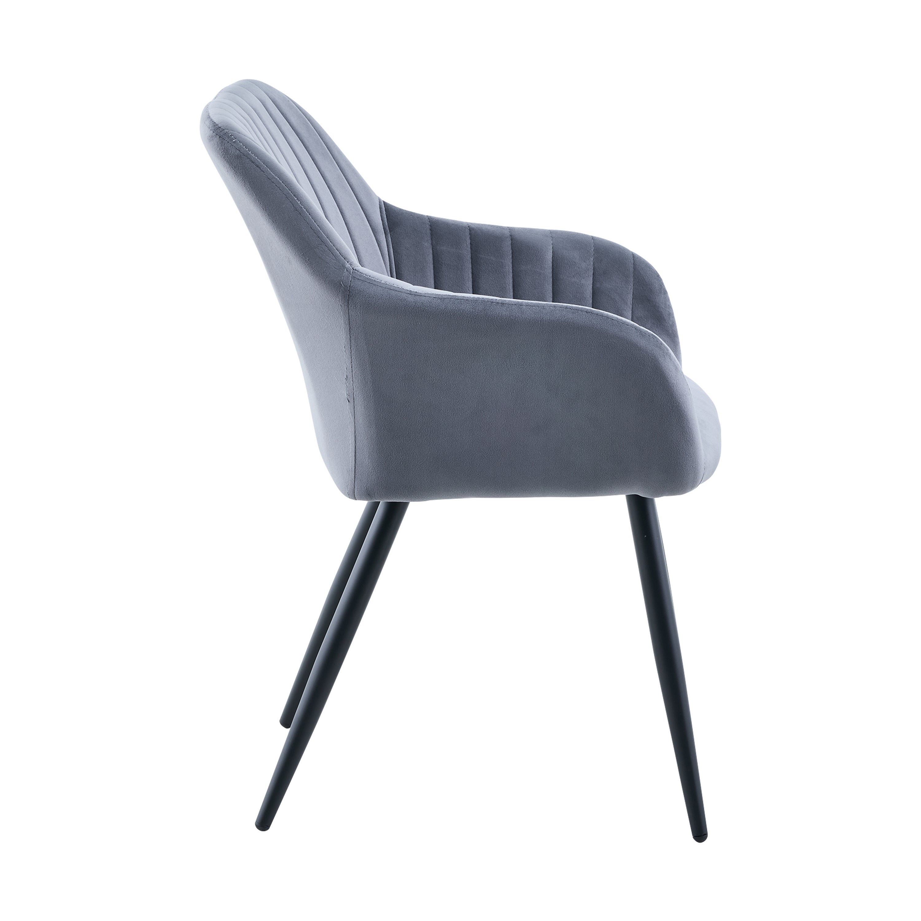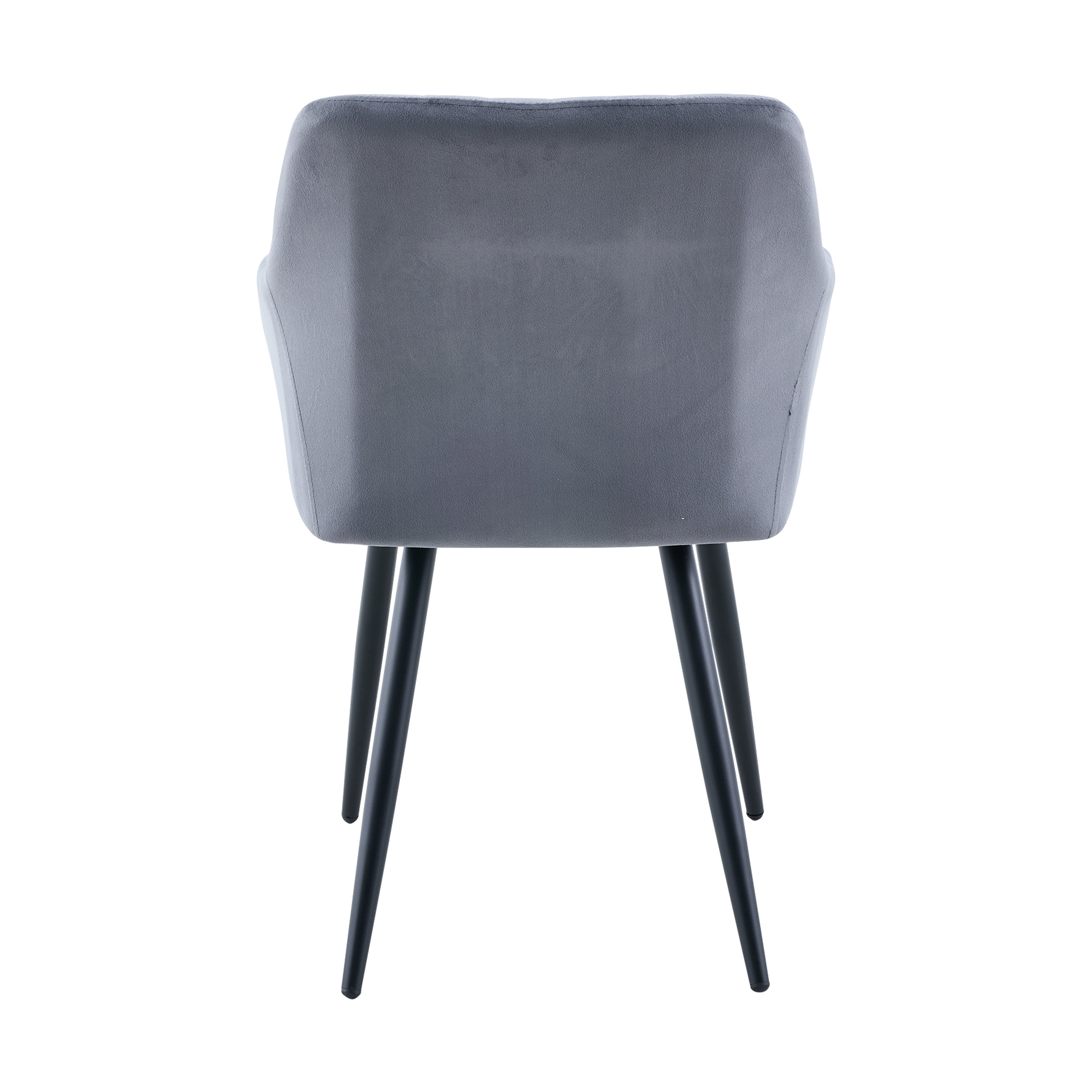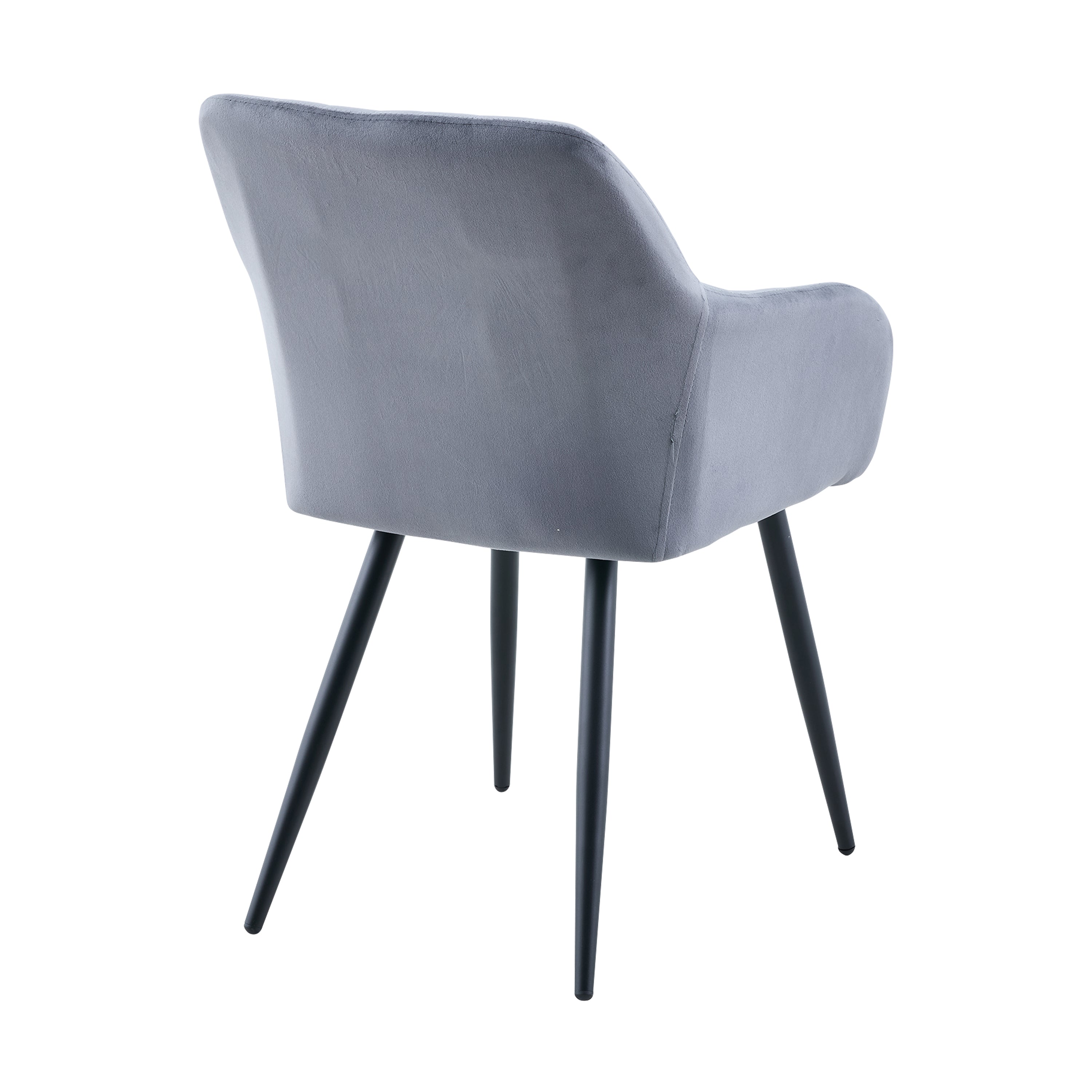 Chaise de salle à manger moderne avec revêtement en velours gris doux, dossier ergonomique baquet et pieds fins en métal noir. Élégante, confortable et idéale pour les repas de tous les jours.