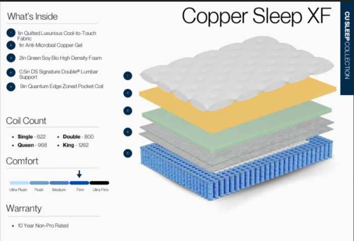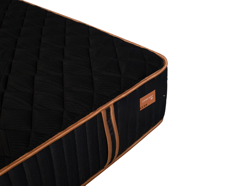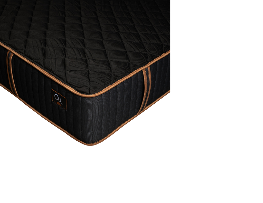 Le matelas Copper allie le soutien réactif de ressorts ensachés individuels à des couches de confort infusées de cuivre, offrant un soulagement équilibré de la pression et une régulation thermique optimale. Sa conception à plateau ferme offre une surface de soutien impeccable et un rembourrage optimal, idéal pour ceux qui recherchent une sensation de fermeté sans sacrifier le confort.